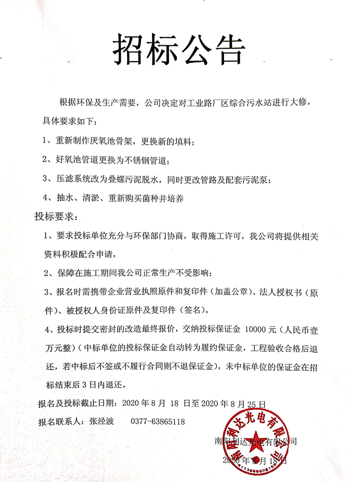 廠區(qū)綜合污水站大修招標(biāo)公告
